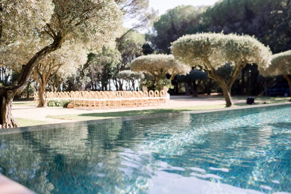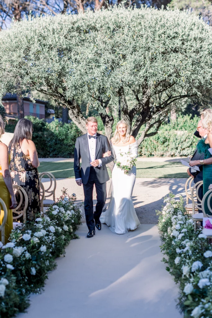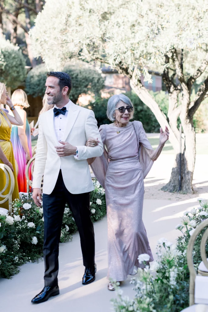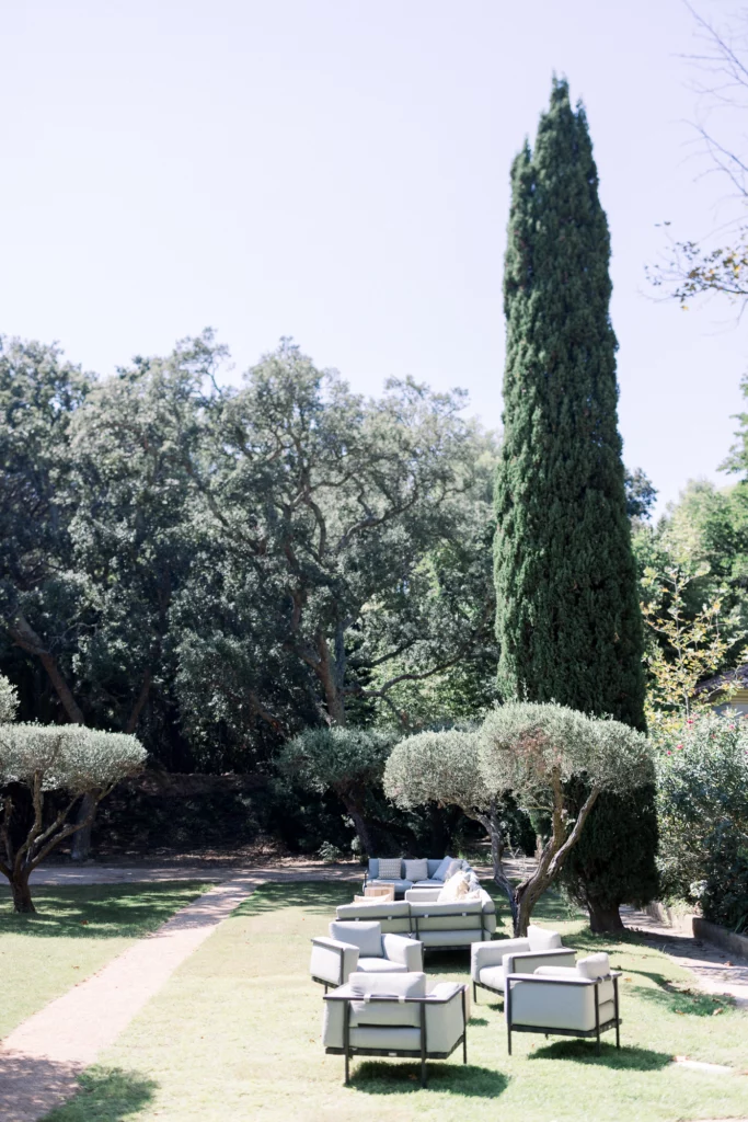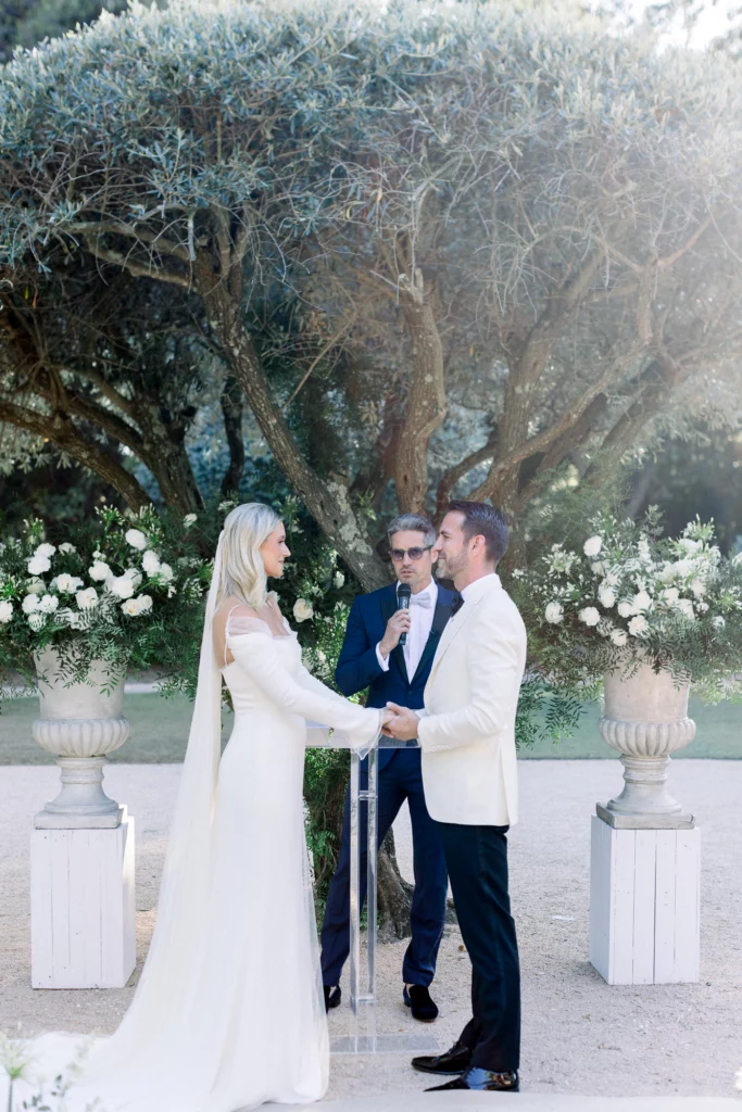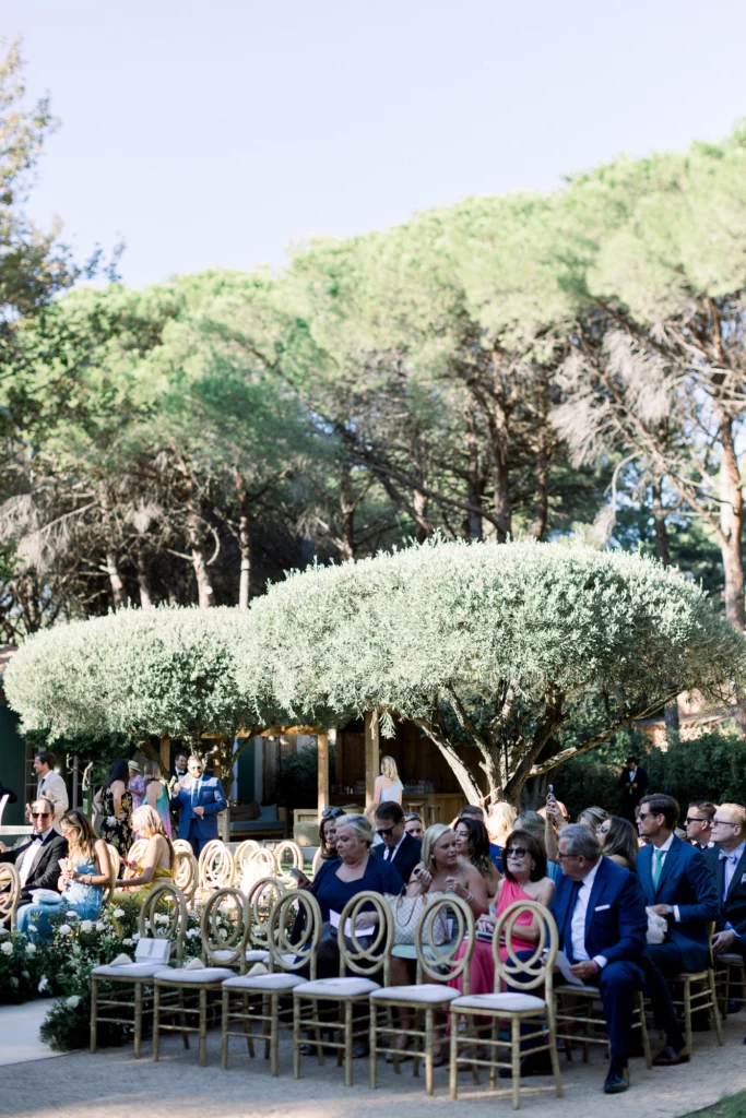 La cérémonie, célébrée sous les oliviers, offrait un cadre naturel et intemporel. Entourés de verdure et baignés de lumière, les vœux ont été échangés dans une ambiance profondément émouvante et sincère. La journée s’est prolongée par un dîner et une soirée en extérieur, entre longues tablées, rires, musique et danse sous le ciel étoilé de la Côte d’Azur.