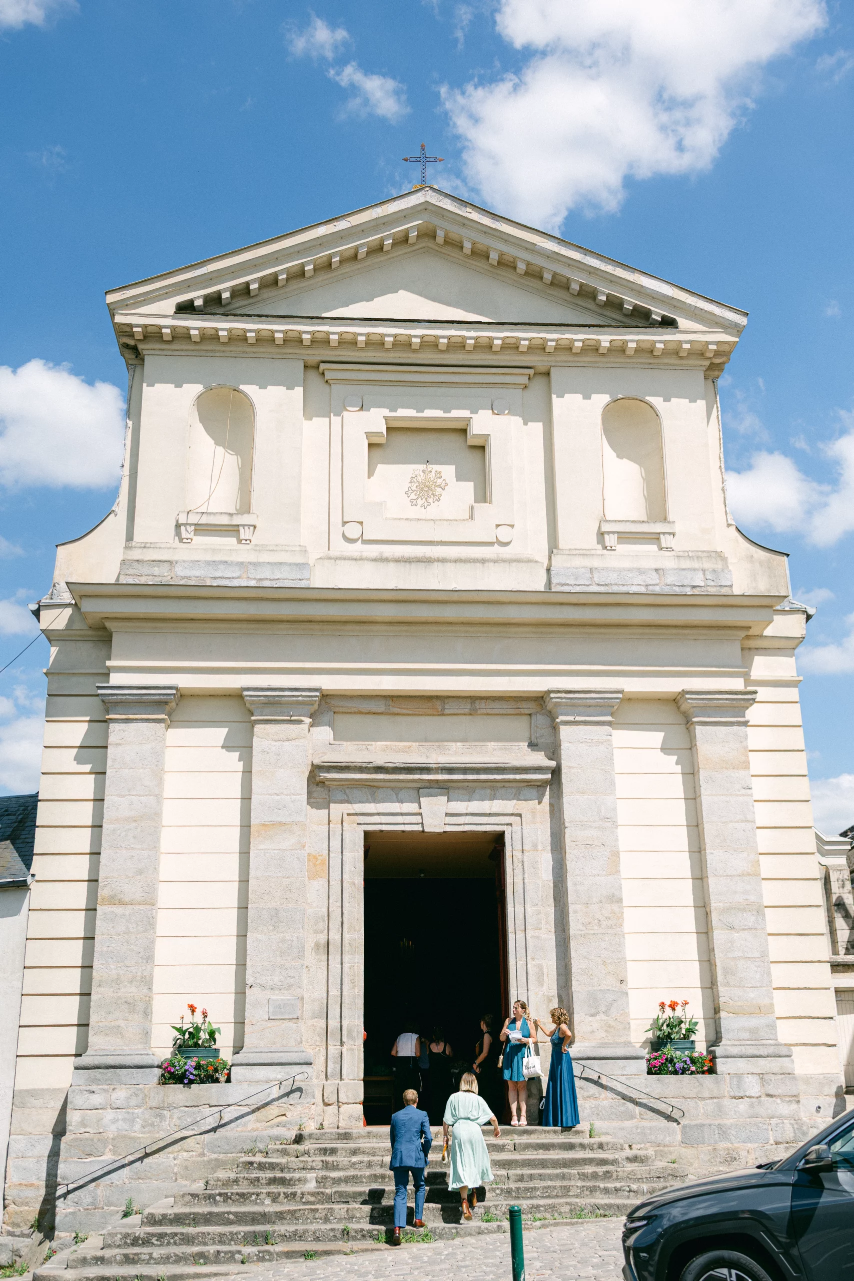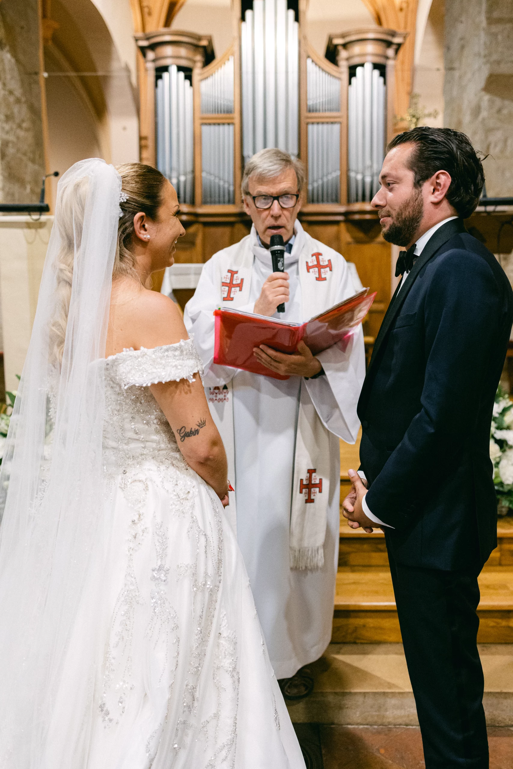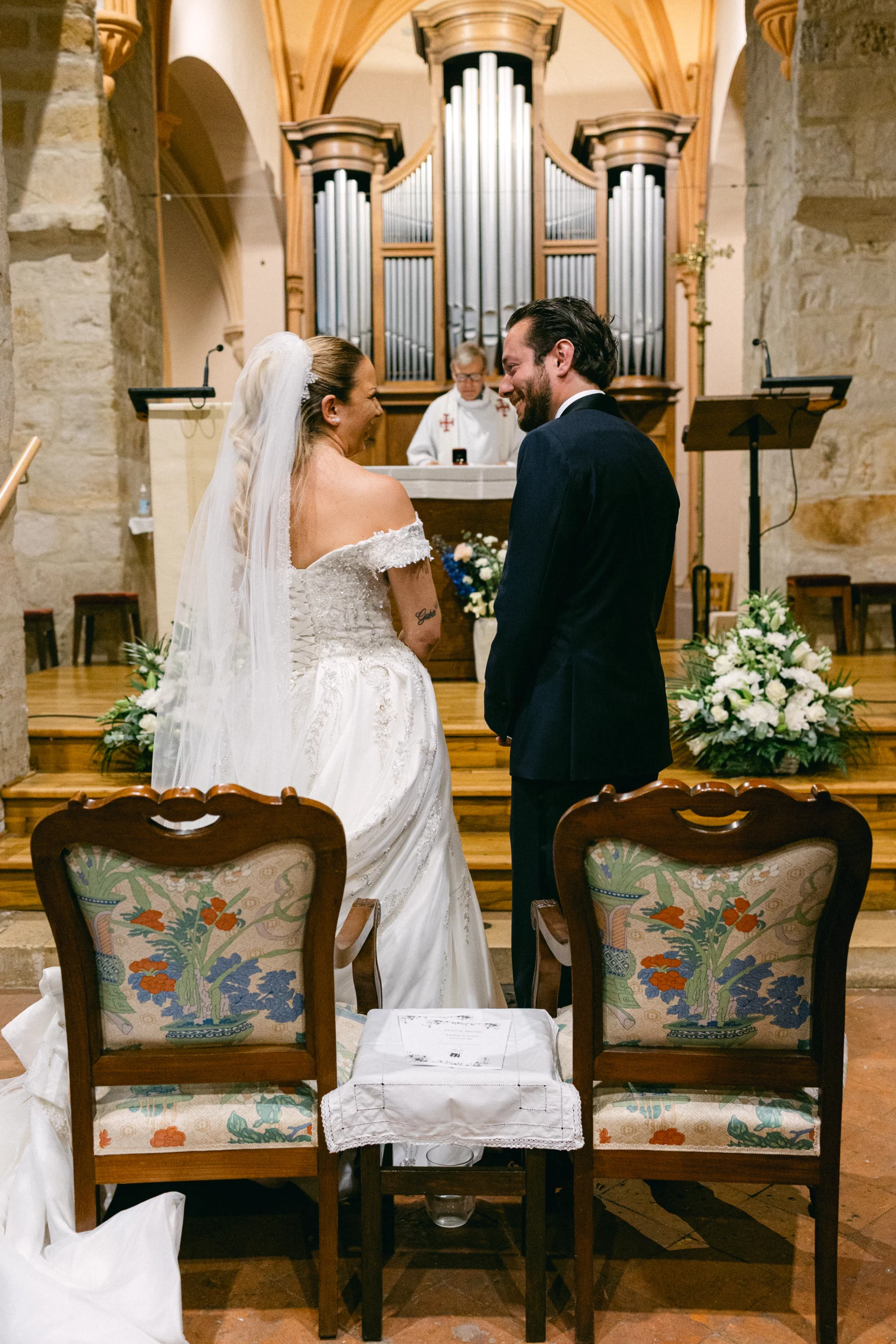 LLa cérémonie religieuse s’est déroulée dans une église près de Paris, baignée de lumière, entourée de la famille et des proches. Les regards, les gestes discrets, les sourires échangés pendant la cérémonie composent le cœur du reportage.