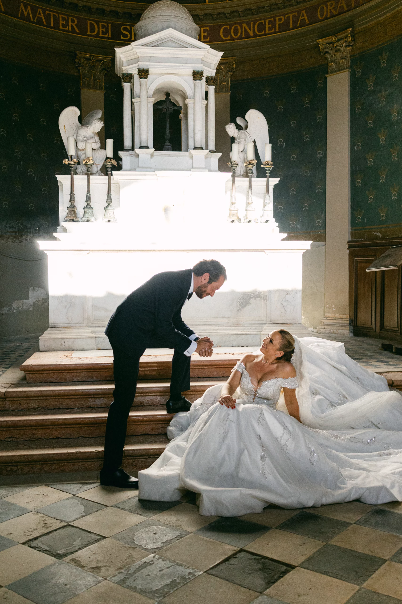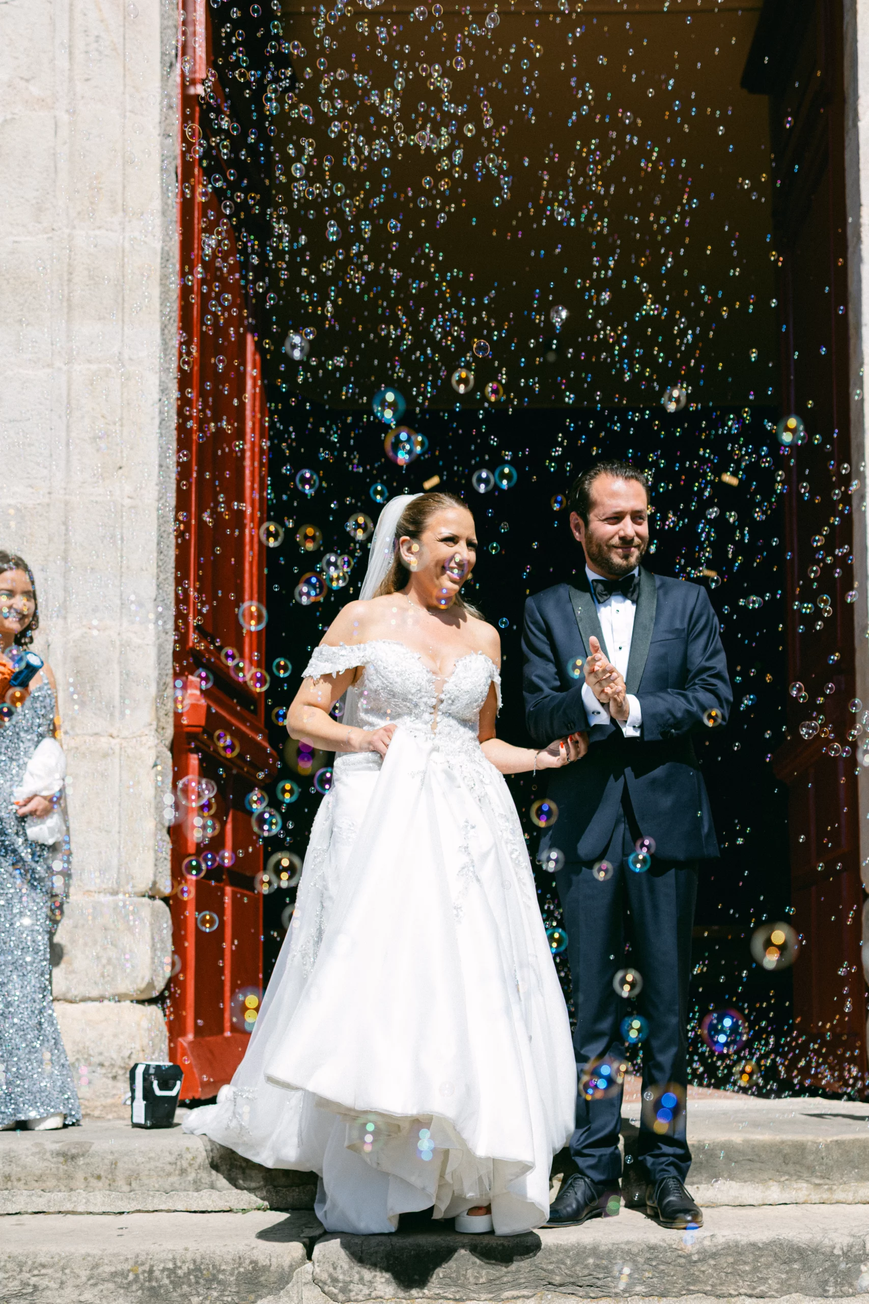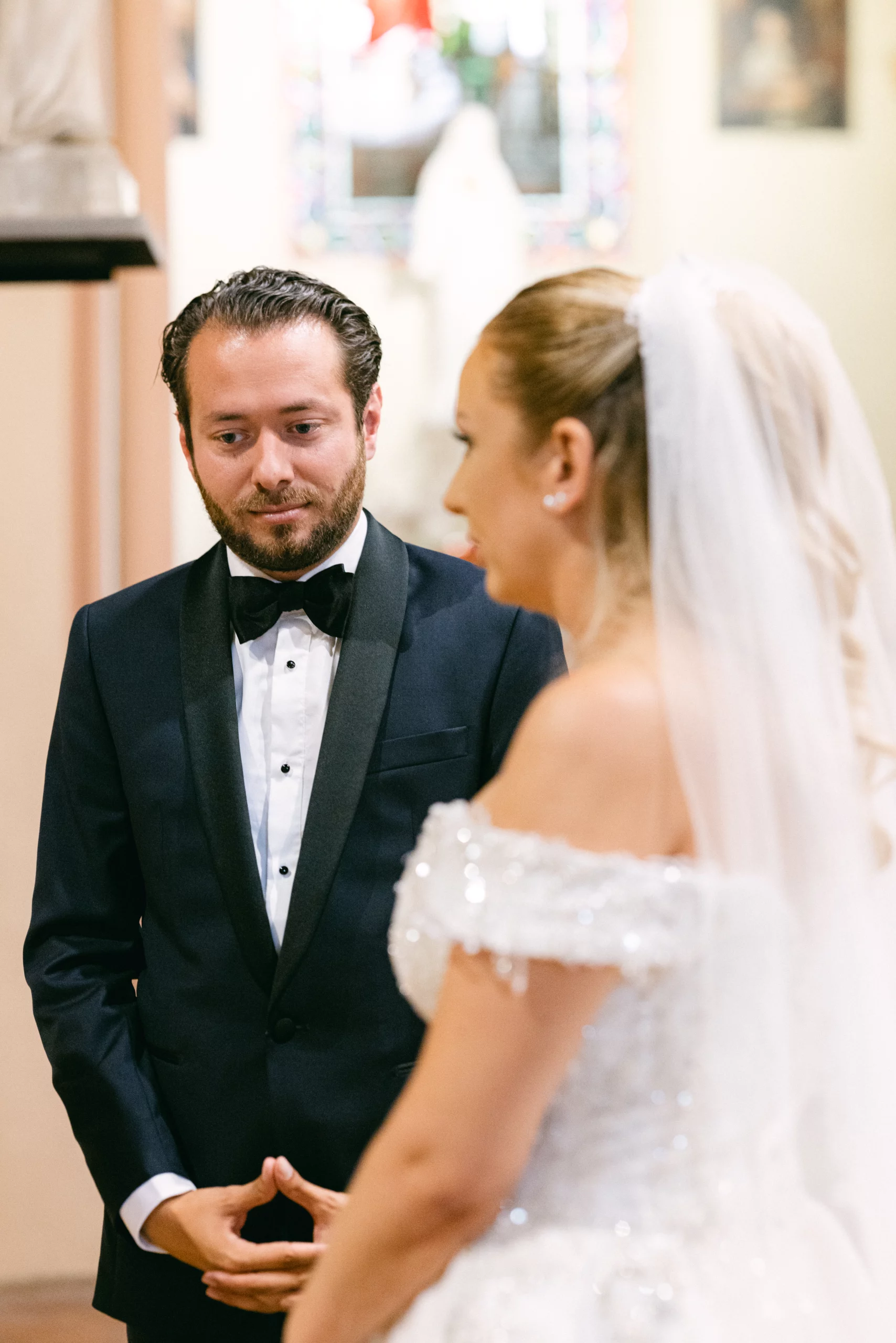 LLa cérémonie religieuse s’est déroulée dans une église près de Paris, baignée de lumière, entourée de la famille et des proches. Les regards, les gestes discrets, les sourires échangés pendant la cérémonie composent le cœur du reportage.