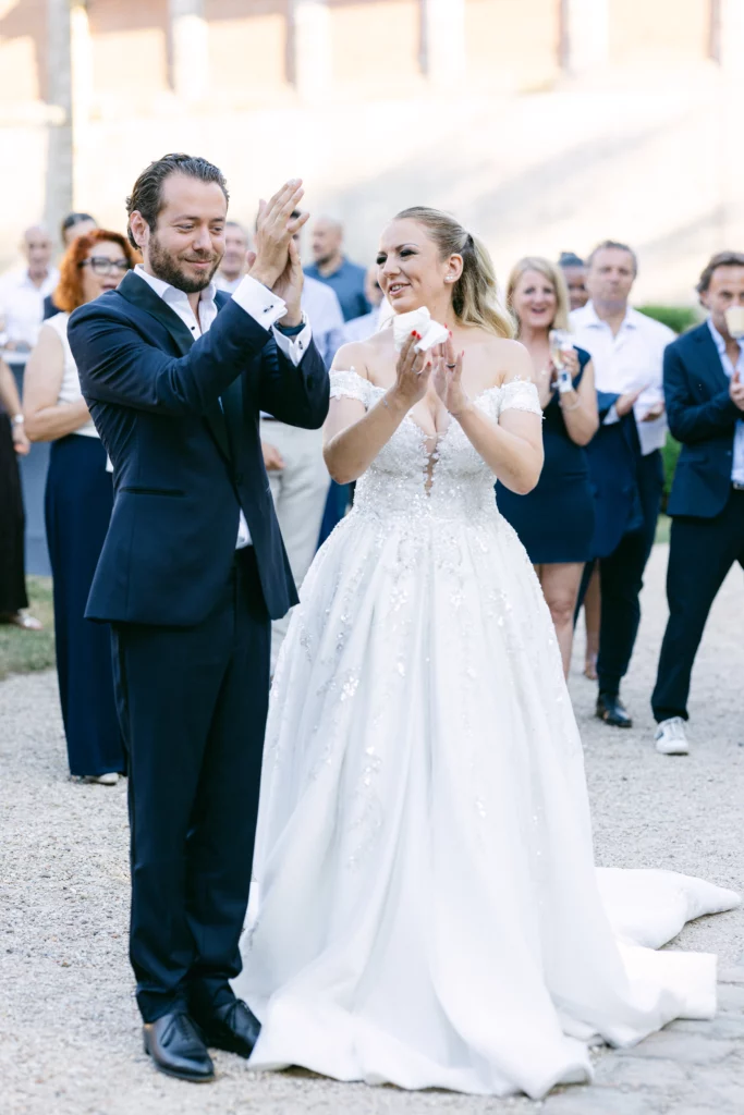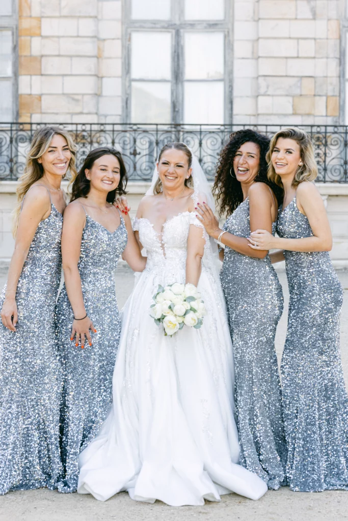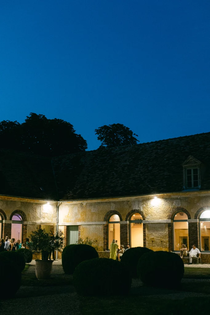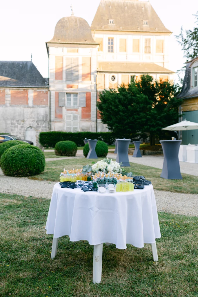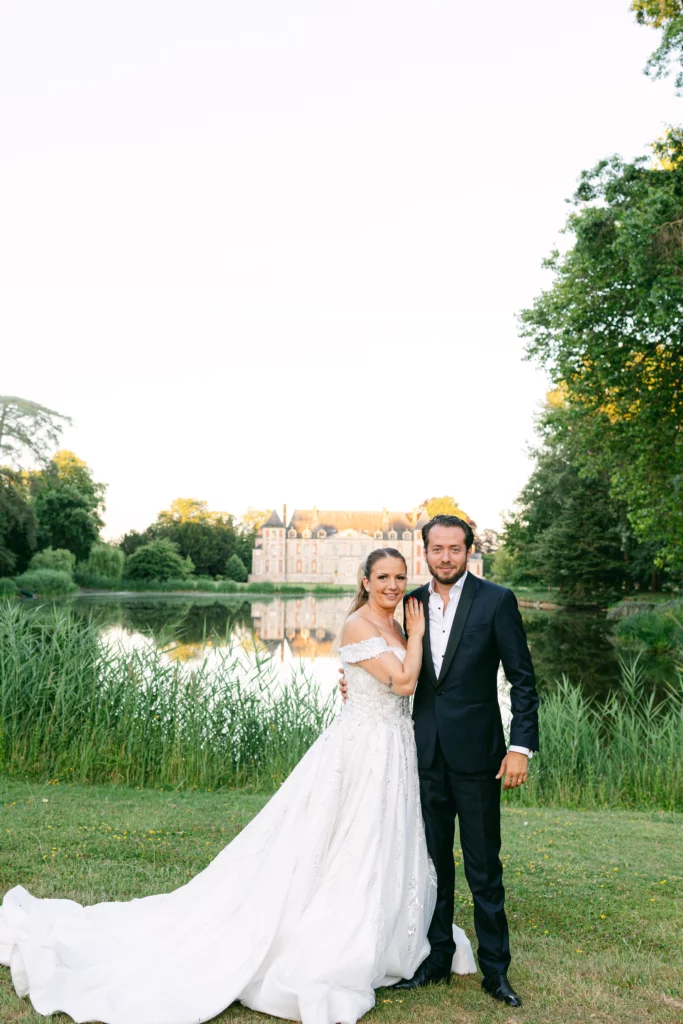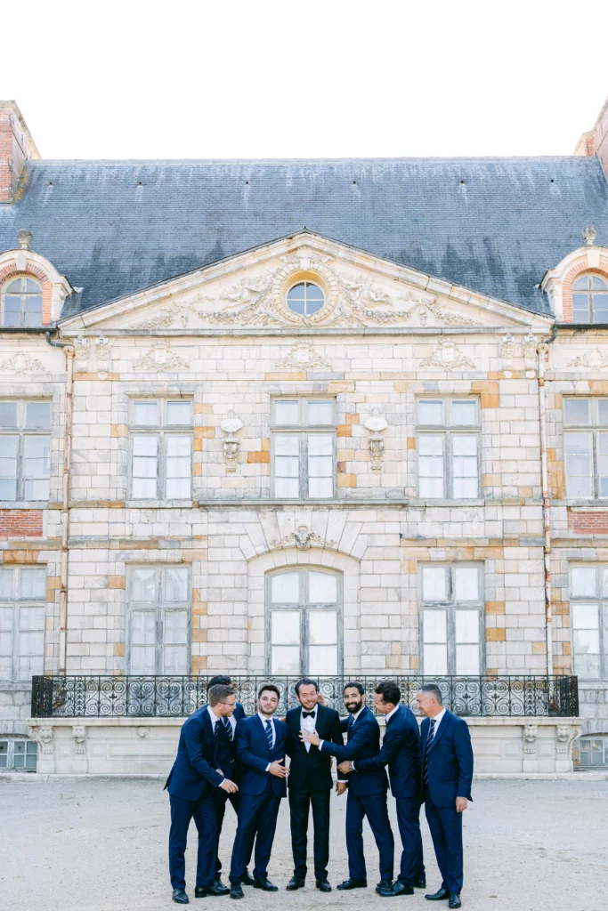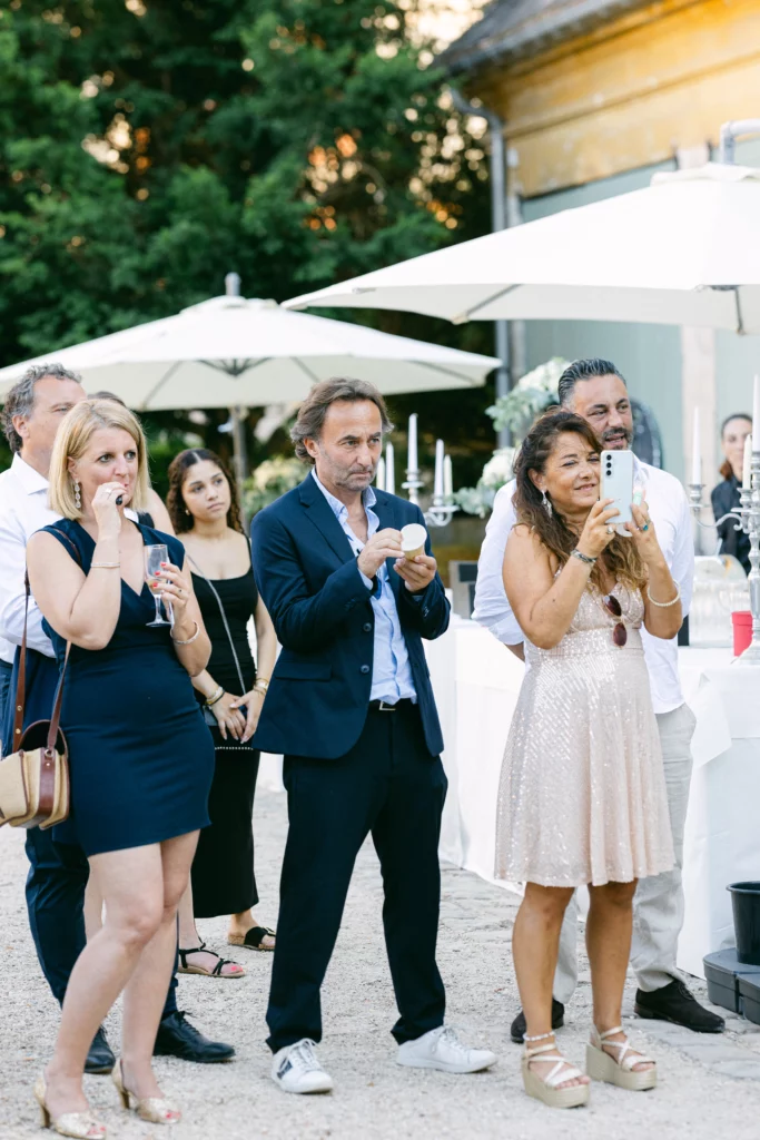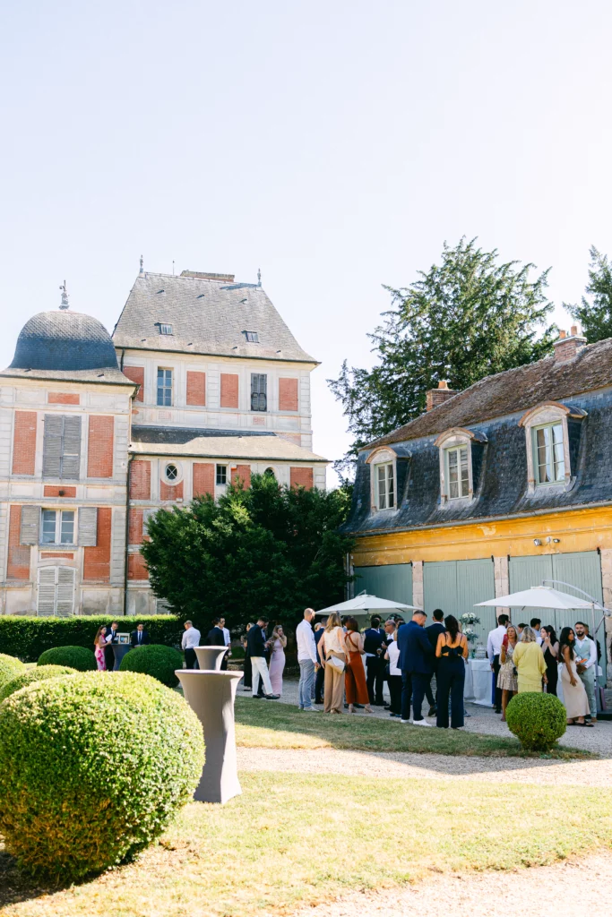 De retour au Domaine de Courson, le cocktail en extérieur a offert une atmosphère conviviale et élégante dans les jardins du château. C’est à ce moment que j’ai réalisé les photos de couple, dans un cadre naturel et romantique, ainsi que les photos de groupe, toujours pensées pour rester fluides et naturelles.